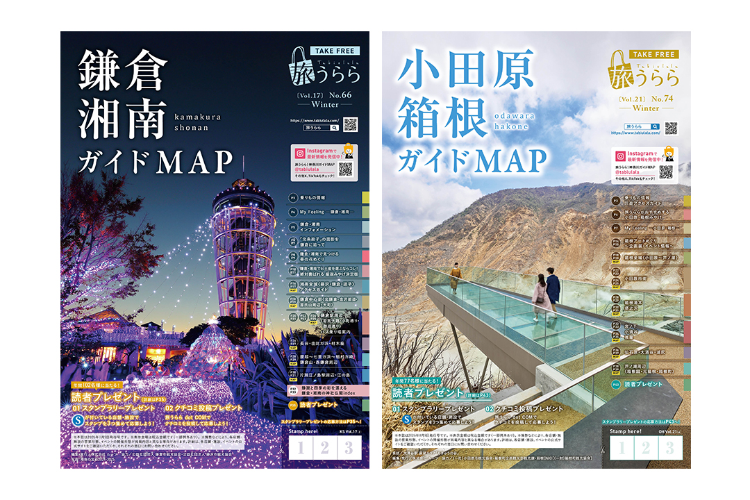1月9日に『旅うらら鎌倉・湘南ガイドMAP No.66』(vol.17)『旅うらら小田原・箱根ガイドMAP No.74』(vol.21)の1月号を発行いたしました。
